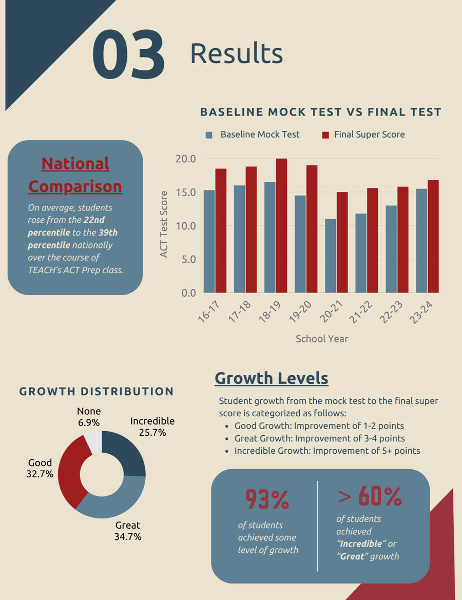 On average, students’ national percentiles increased by 17 points, rising from the 22nd to the 39th percentile during the ACT Prep class