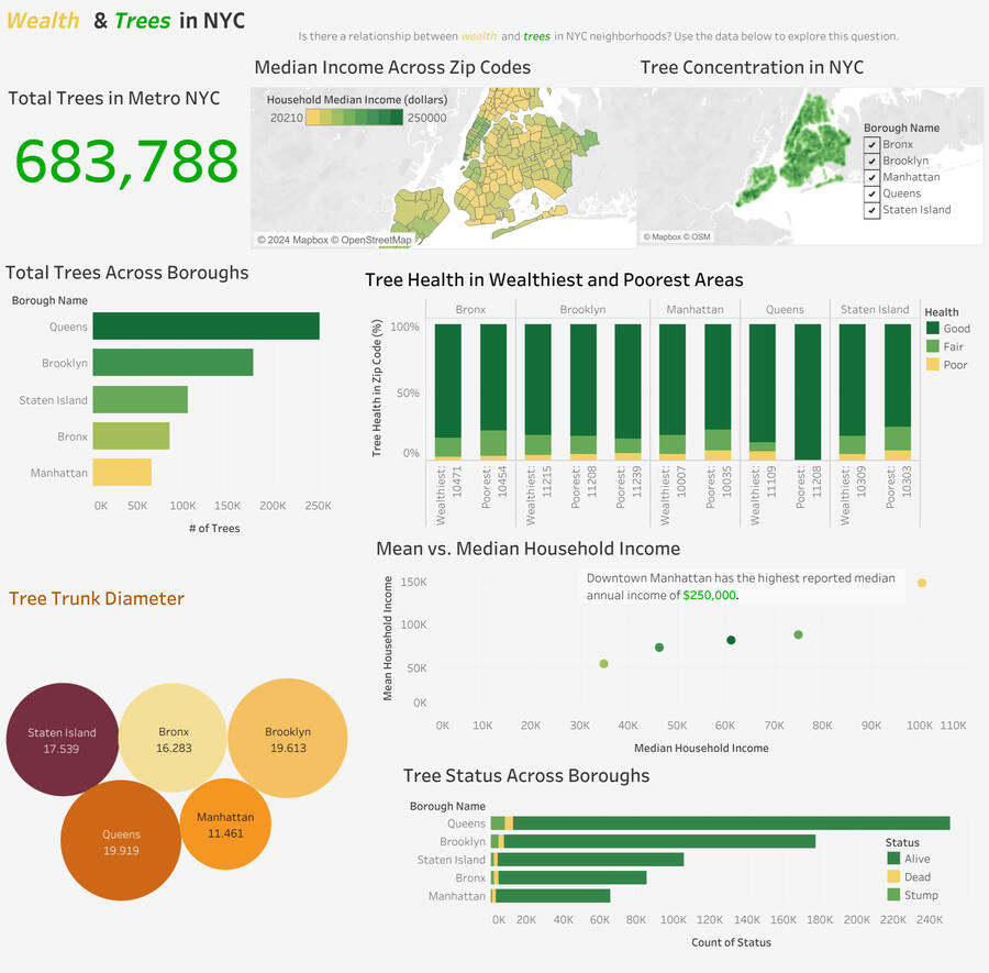 Developed an interactive Tableau dashboard to explore the relationship between wealth and trees in New York City.DATA: