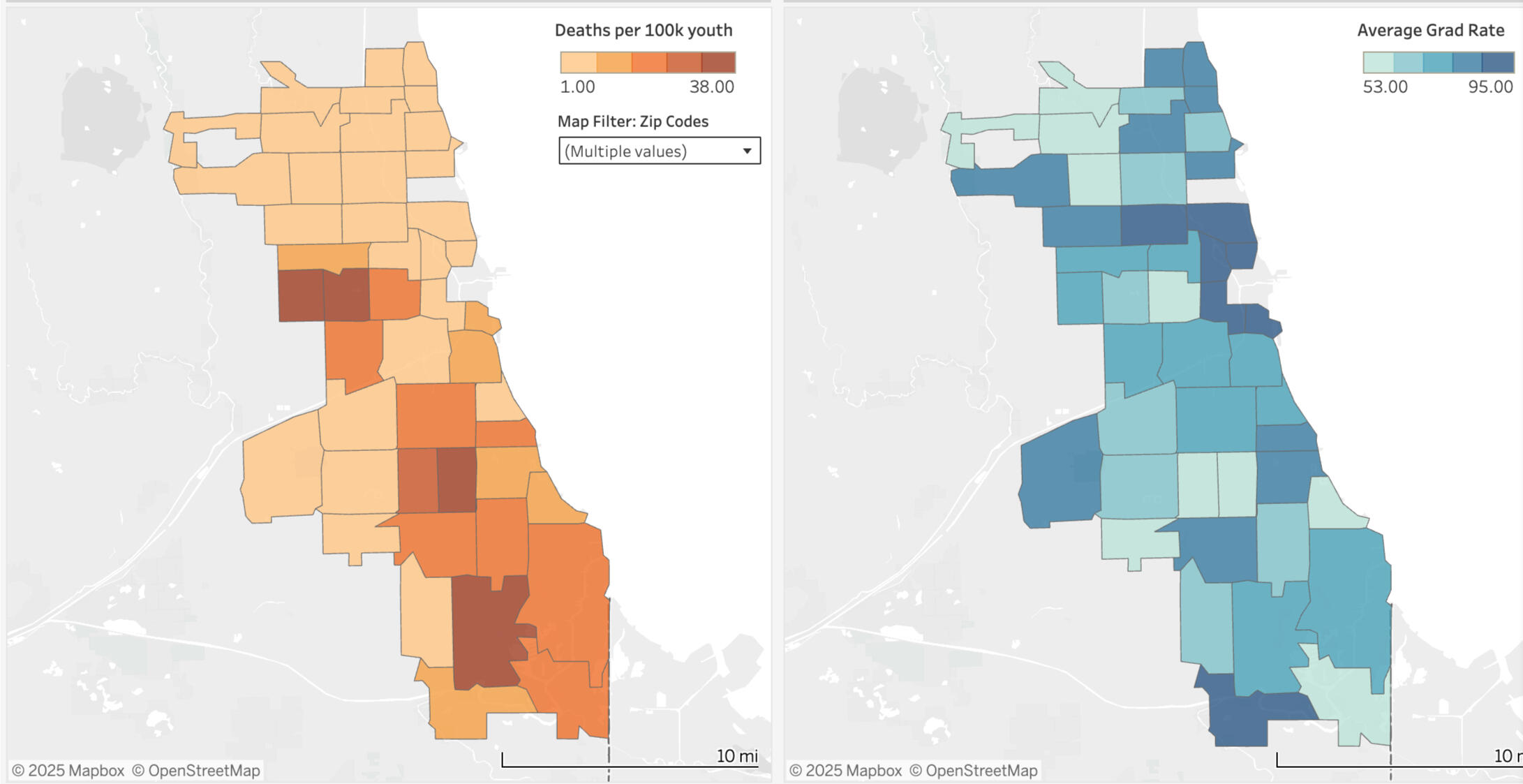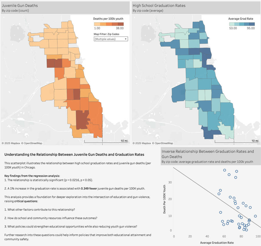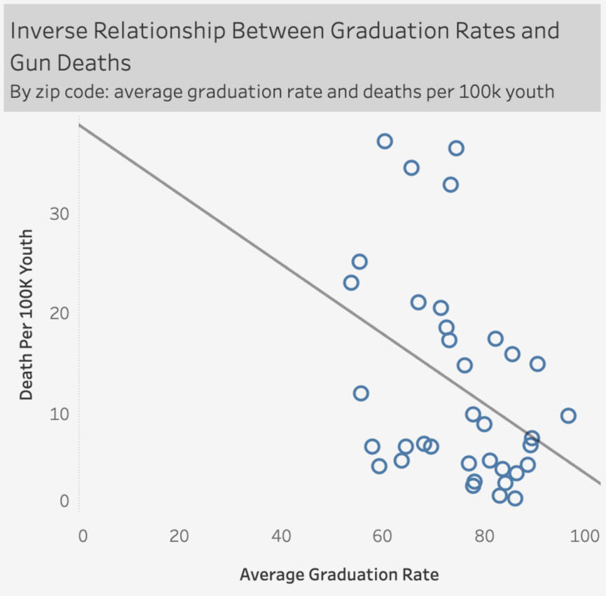 Explored the relationship between youth gun deaths and high school graduation rates across Chicago ZIP codes using publicly available data (2018-2021). Conducted hypothesis test, and regression analysis, as well as created data visualizations, revealing a statistically significant inverse relationship between graduation rates and juvenile gun deaths.DATA:
