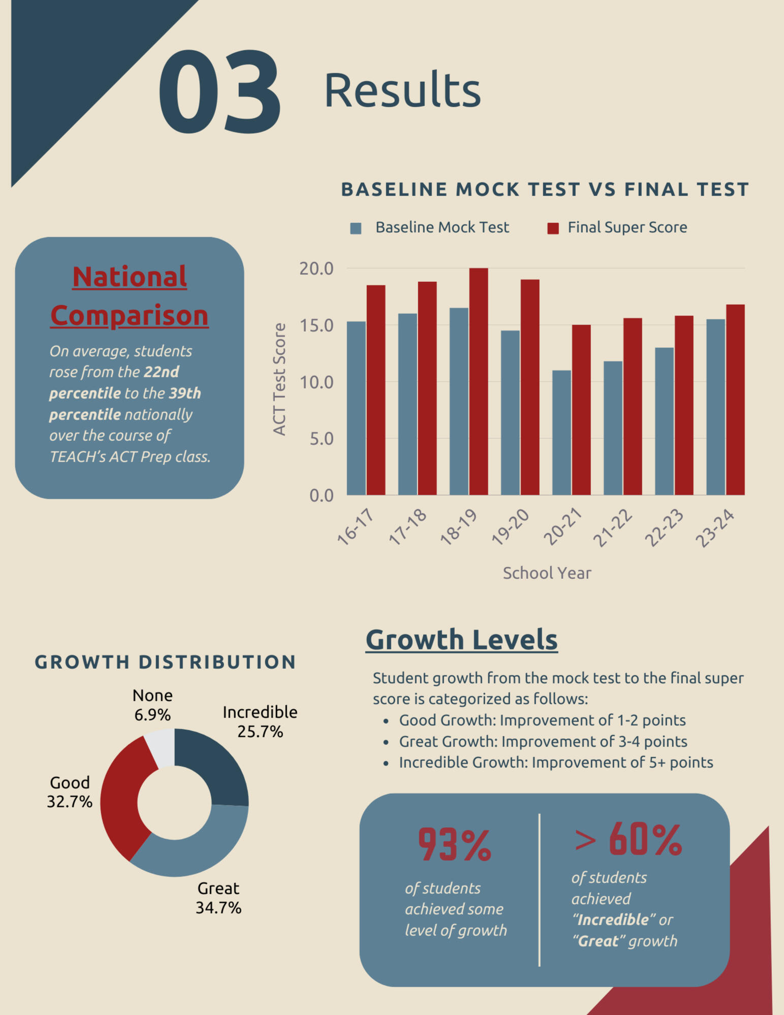 On average, students’ national percentiles increased by 17 points, rising from the 22nd to the 39th percentile during the ACT Prep class