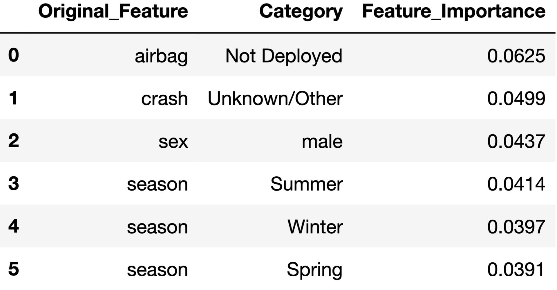 - INSIGHT #2: The top contributing factors identified in severe crashes are airbag deployment, males, and seasonality. The feature importance output from the decision tree model highlights these variables as having the greatest influence on crash severity.