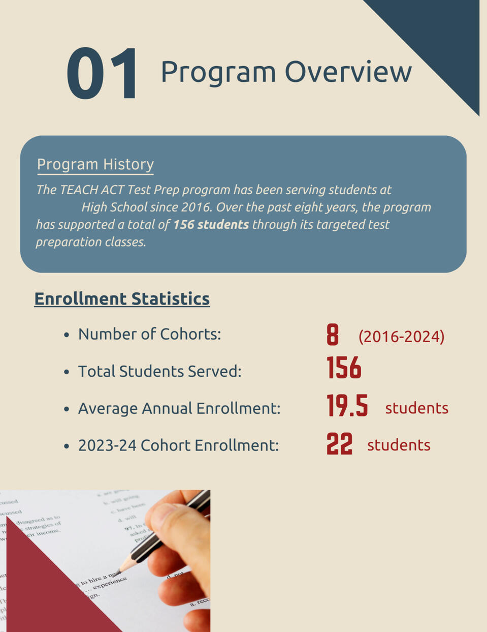 Developed a 5-page data report analyzing the effectiveness of the ACT Prep program over 8 years, summarizing key trends, improvements in scores, and national comparisons.DATA: