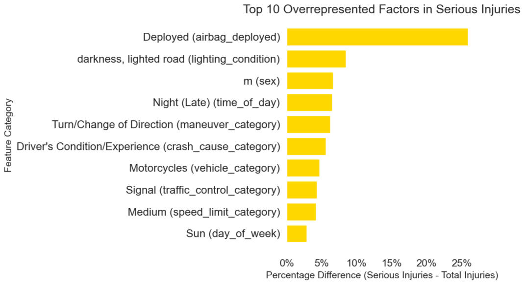 - INSIGHT #1: Overrepresented factors in severe crashes include airbag deployment, light condition, and males.