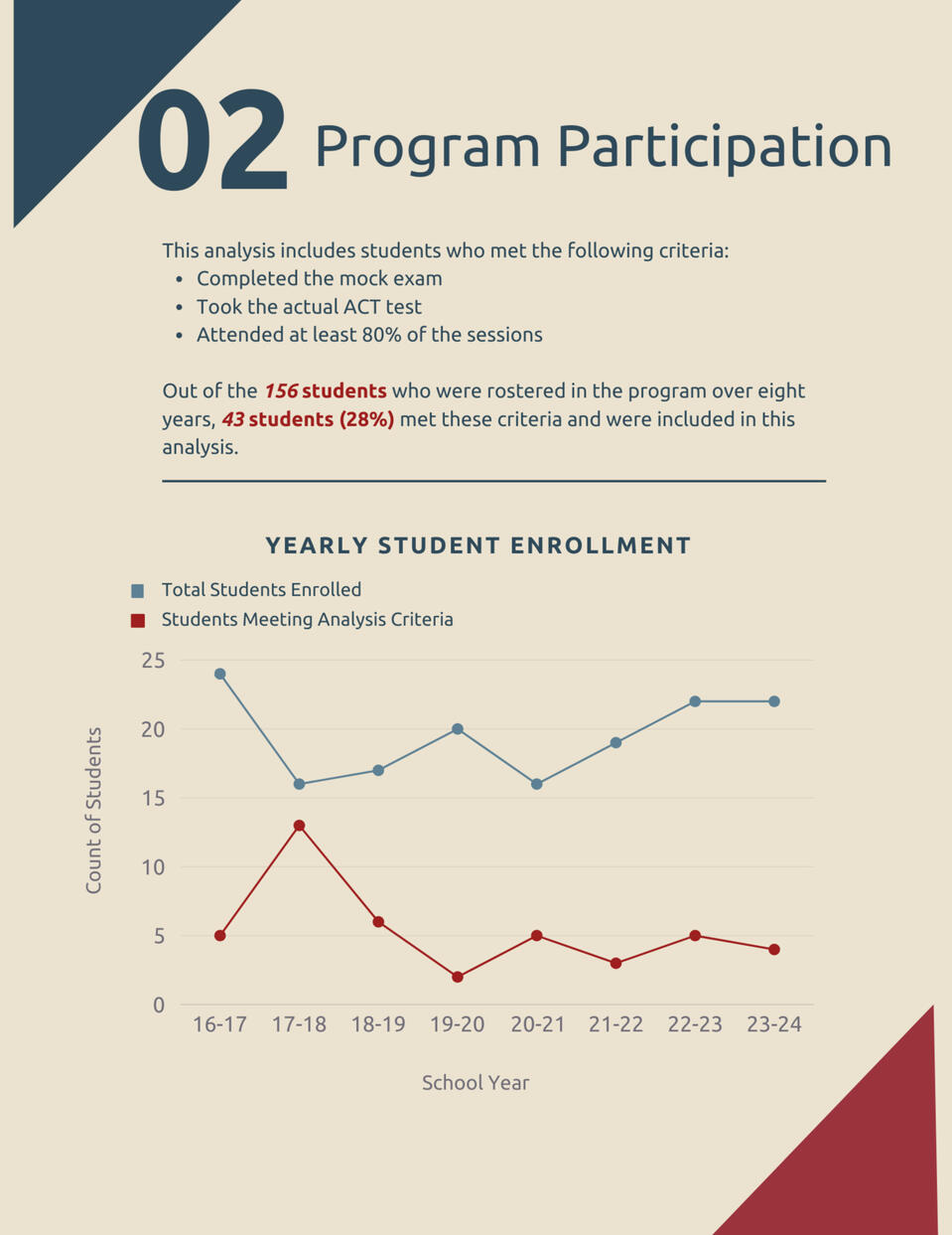 Analyzed data from 8 cohorts, serving 156 students with an average enrollment of 19.5 students per cohort.INSIGHTS